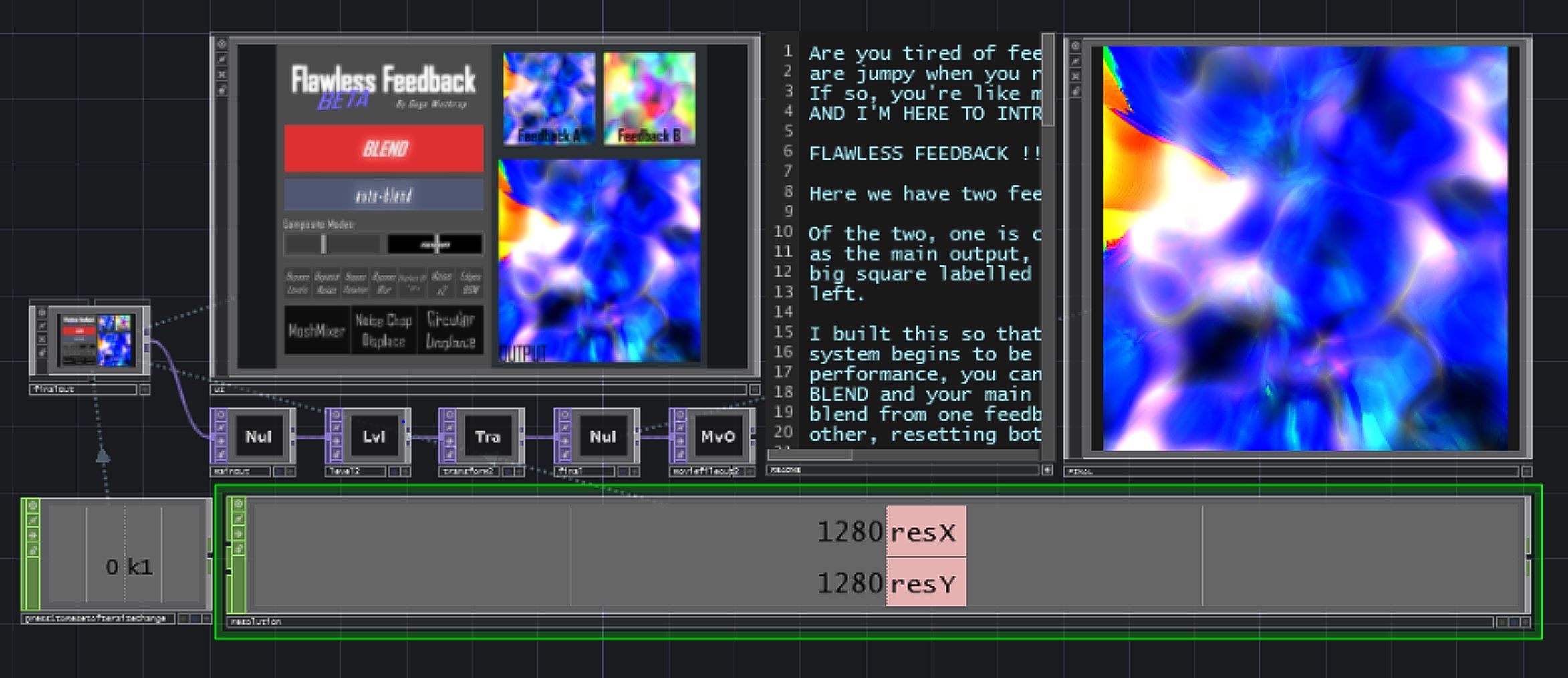 Command every moment of your visual performance with this easy-to-use TouchDesigner tool for VJ’s and artists. Use it to sync visual events with music or other performance, or simply set it to auto-blend and walk away for a gallery or installation setting. Use the download tab in the menu above to download FlawlessFeedbackBETA.toe for free! Instructions for use are inside the .toe