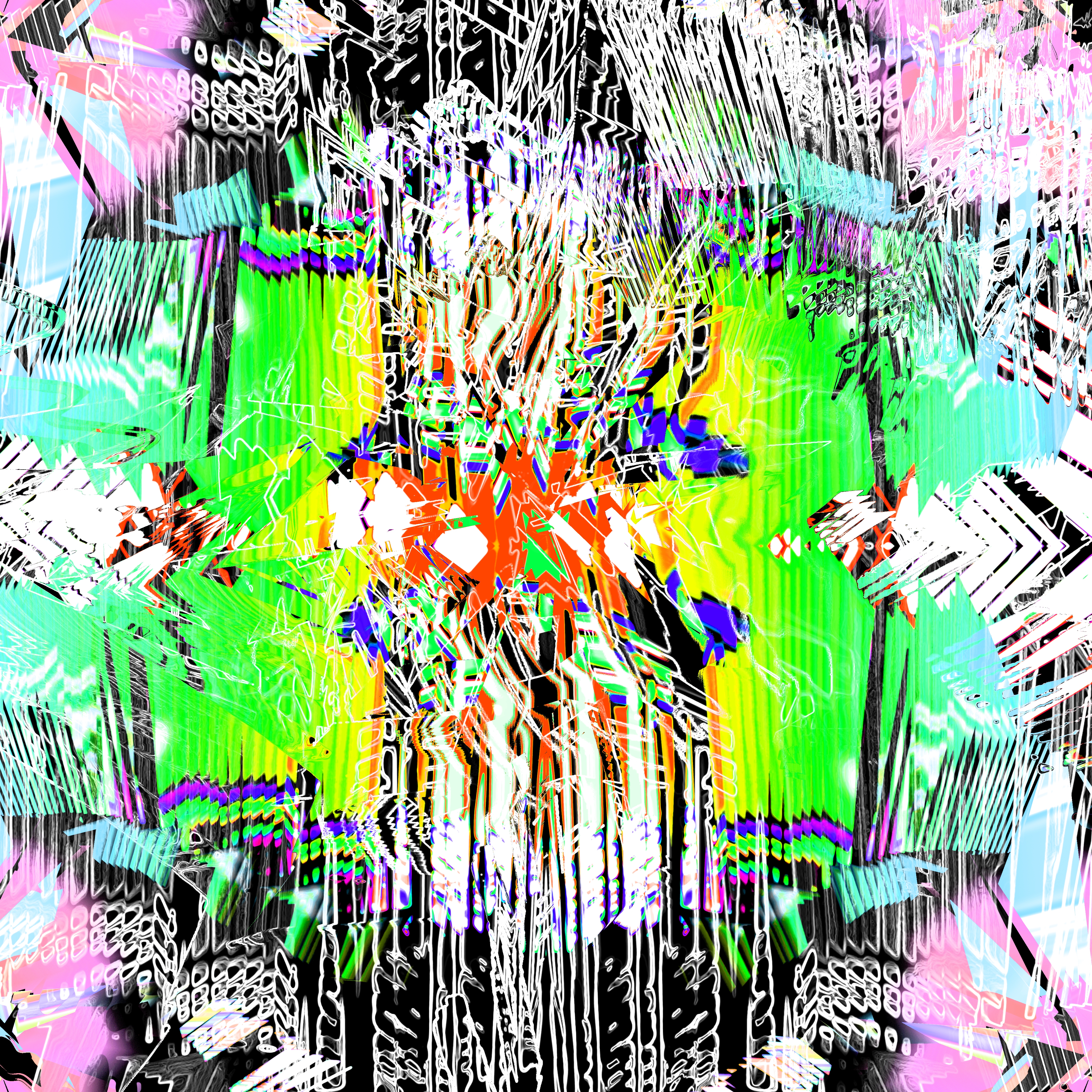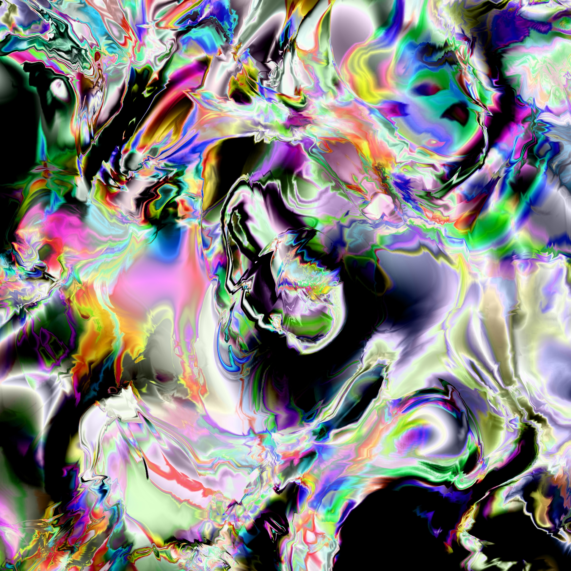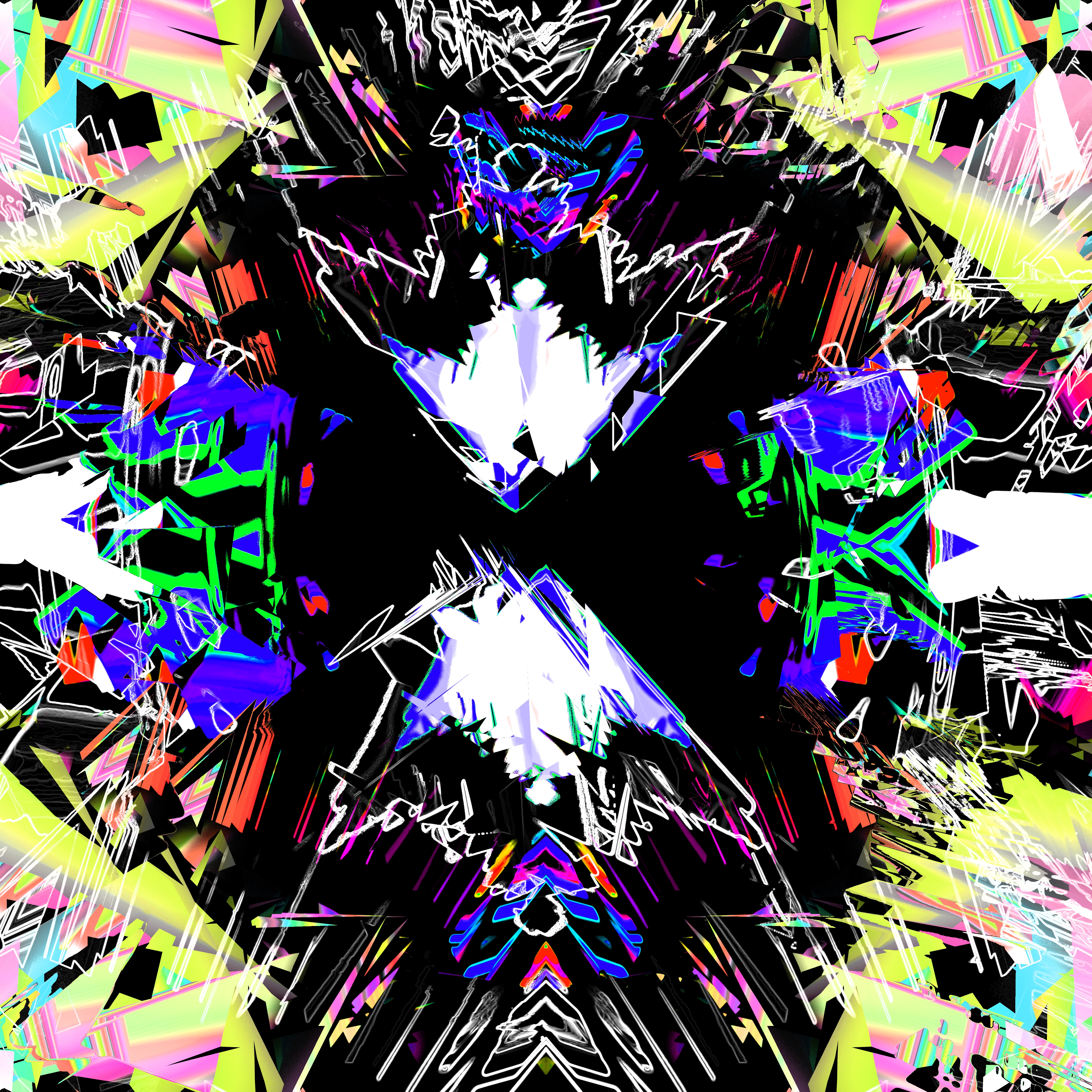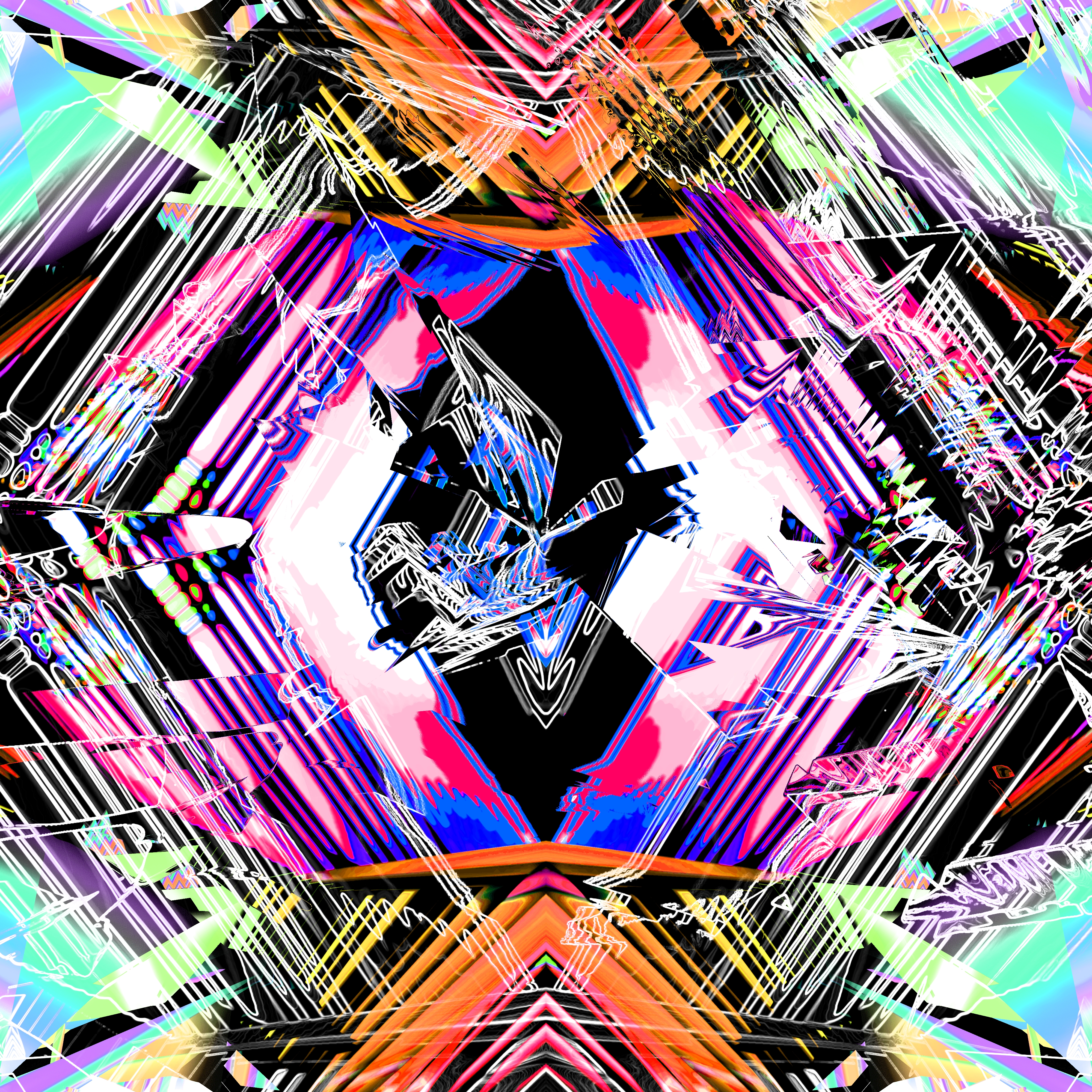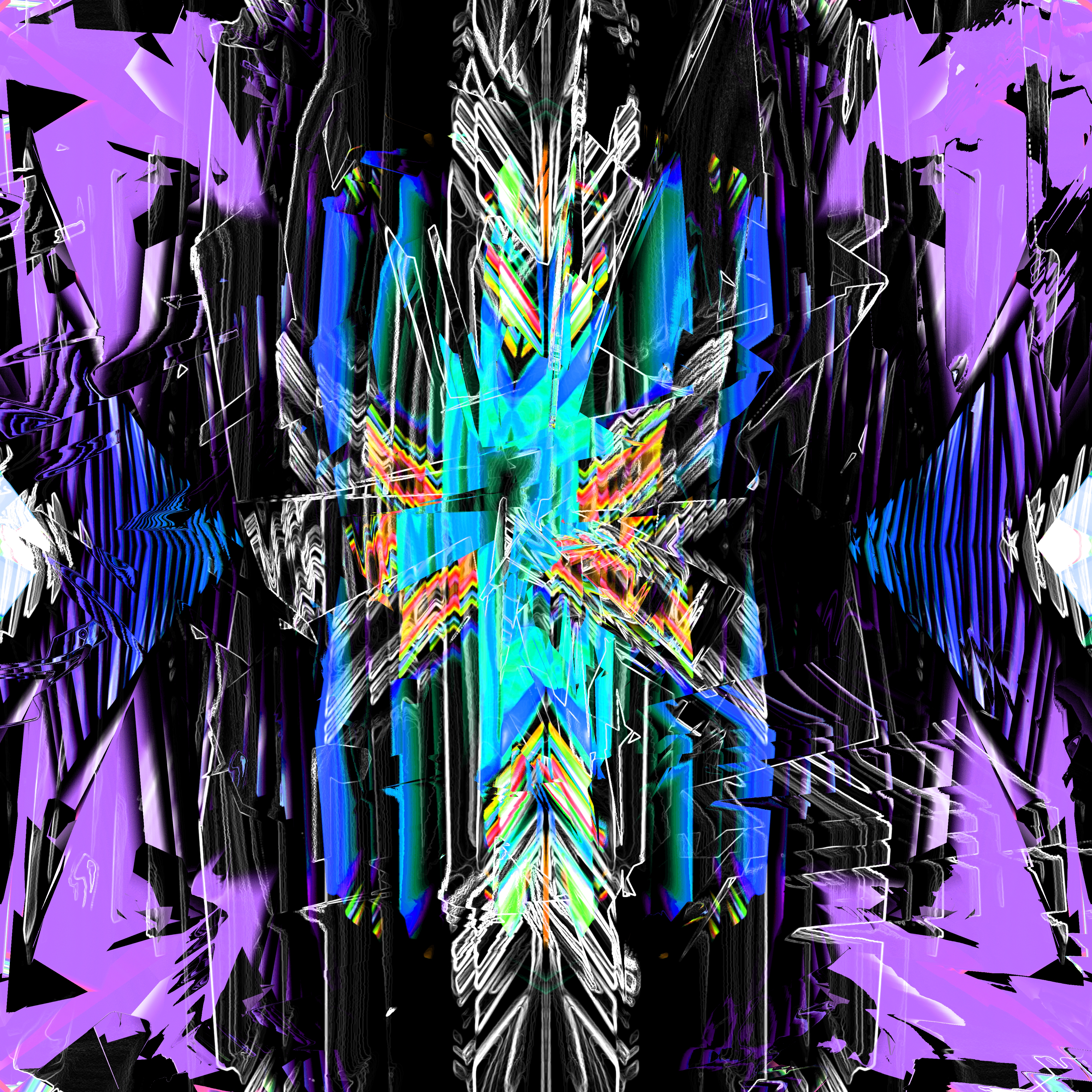 In the art world, we can discover psychedelia by exploring symmetry. But as is often found in the case of a real psychedelic experience, noise, imperfections, and alien imbalance in the visuals play a key role. I strive to avoid a psychedelia that is fitted with straight edges and jagged lines. In this study, I aim to create a psychedelia that is loosely symmetrical and highly colorful- overlapping geometries and colored layers fuse together to generate unexpected hues and forms, while still maintaining a consistent balance of whites, blacks and greys in the composition. While from afar the piece appears to be smooth and flowing by design, looking closely will reveal a deceptively glitchy pixel displacement in certain areas of the piece, giving it a certain digital touch that I love so much.