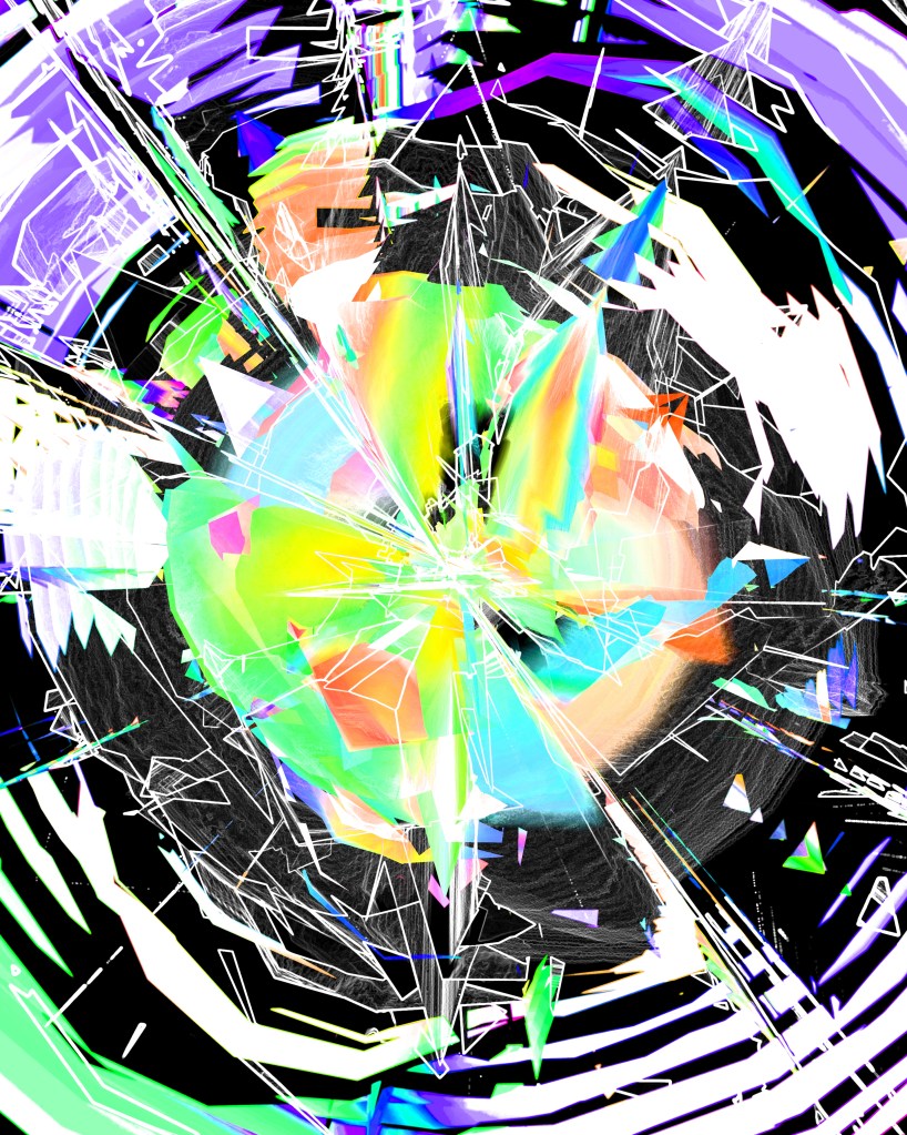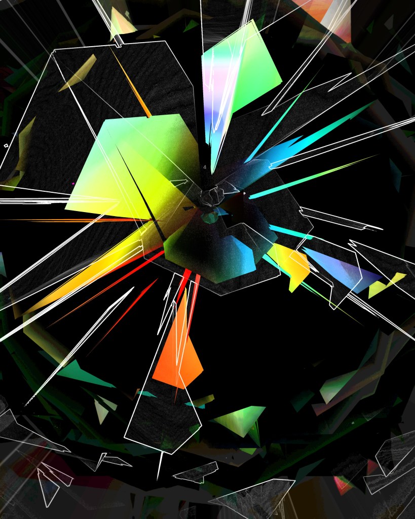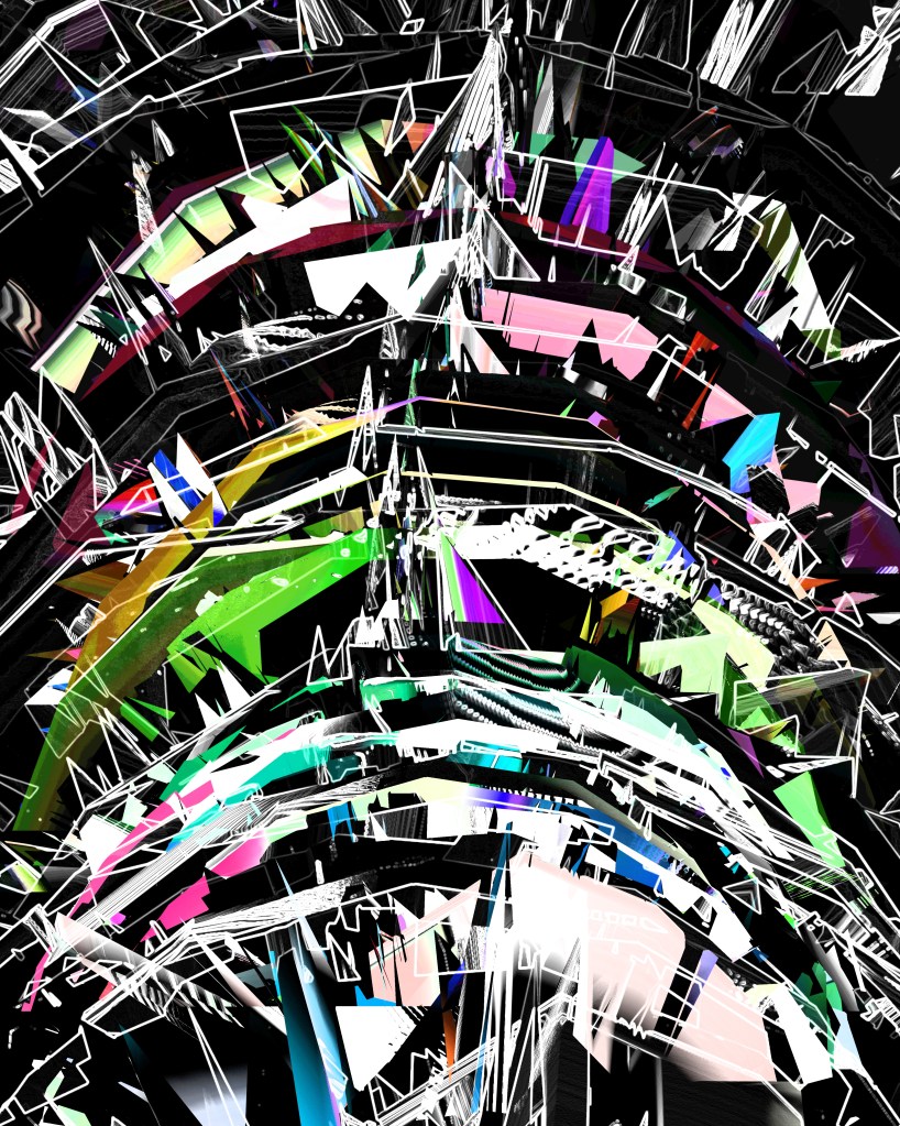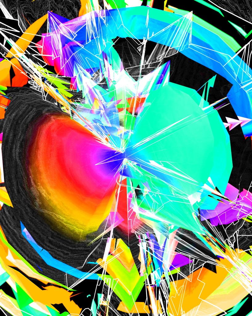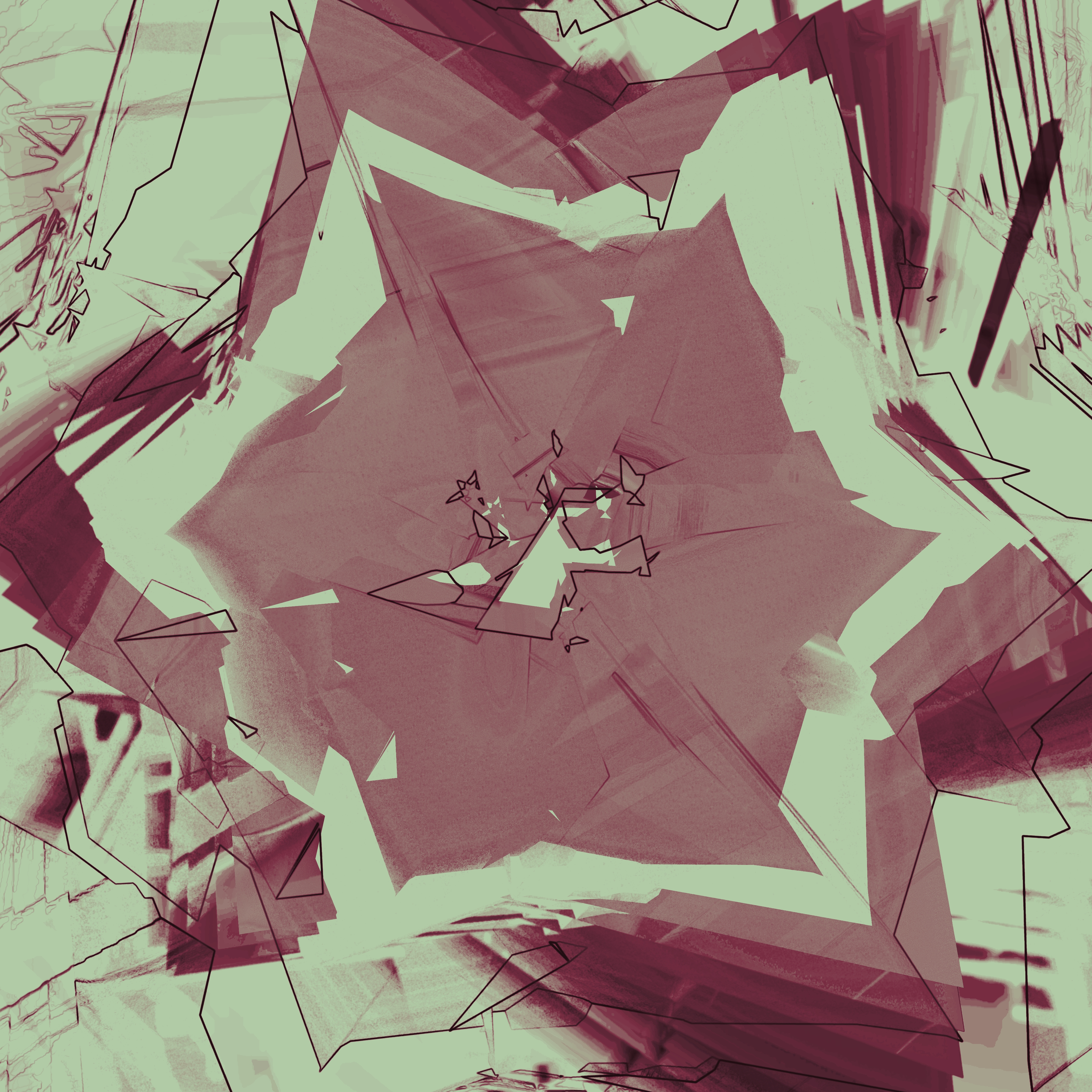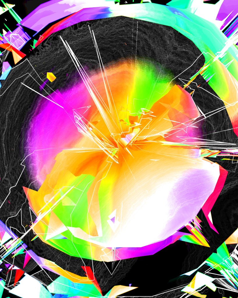 In the art world, we can discover psychedelia by exploring symmetry. But as is often found in the case of a real psychedelic experience, noise, imperfections, and alien imbalance in the visuals play a key role. I strive to avoid a psychedelia that is fitted with straight edges and jagged lines. In this study, I aim to create a psychedelia that is loosely symmetrical and highly colorful- overlapping geometries and colored layers fuse together to generate unexpected hues and forms, while still maintaining a consistent balance of whites, blacks and greys in the composition. While from afar the piece appears to be smooth and flowing by design, looking closely will reveal a deceptively glitchy pixel displacement in certain areas of the piece, giving it a certain digital touch that I love so much.