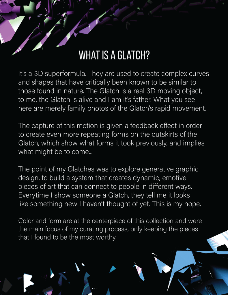 This was in the same vein of my first generative art project, found lower in this page, called Psuedo-Symmetry. The idea of an imperfect symmetry has been a part of my artistic identity for years and I wanted a chance to explore those concepts with my Glatches as well.